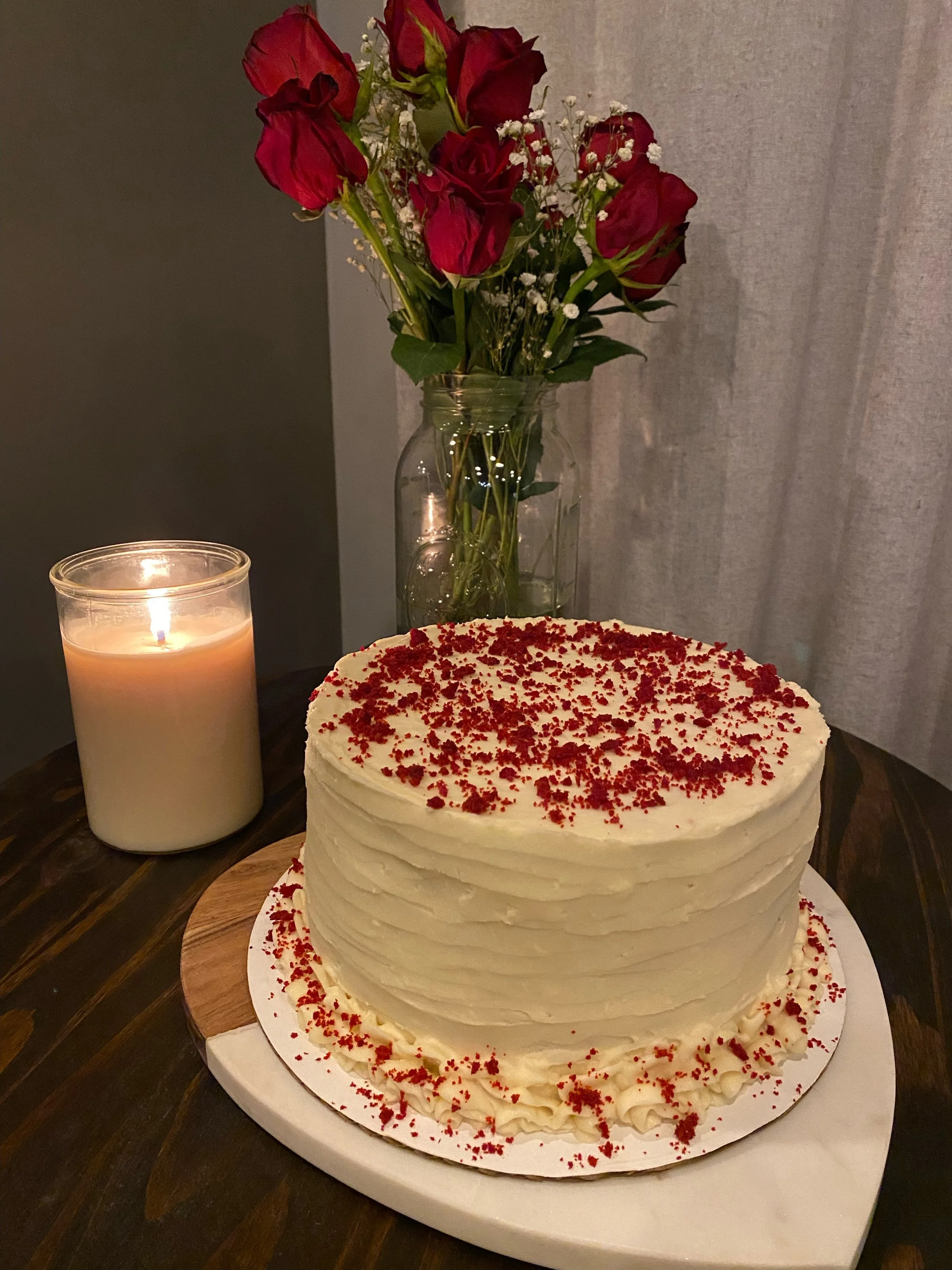 Moist chocolate cake tinted red for a regal flair. It is filled and covered in a traditional cream cheese frosting that blends well with the unique flavors of the cake.